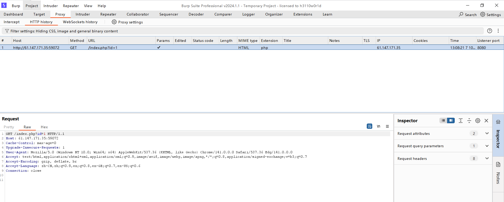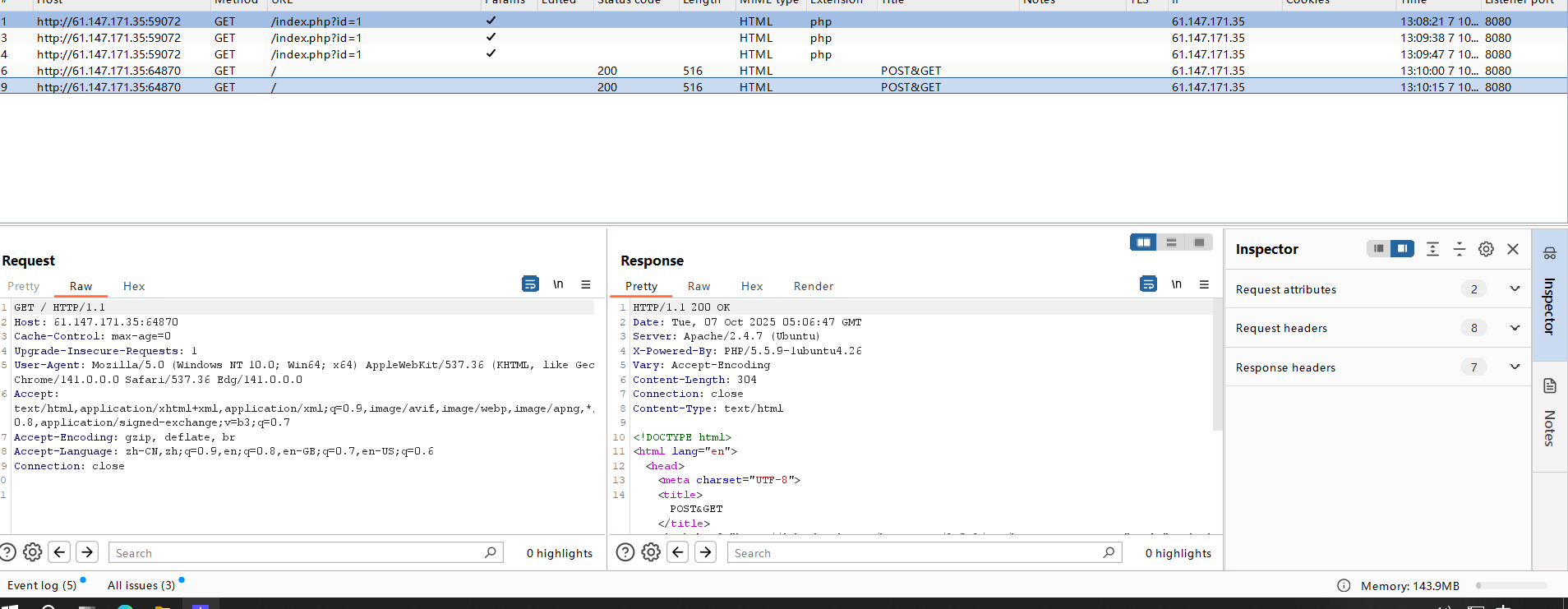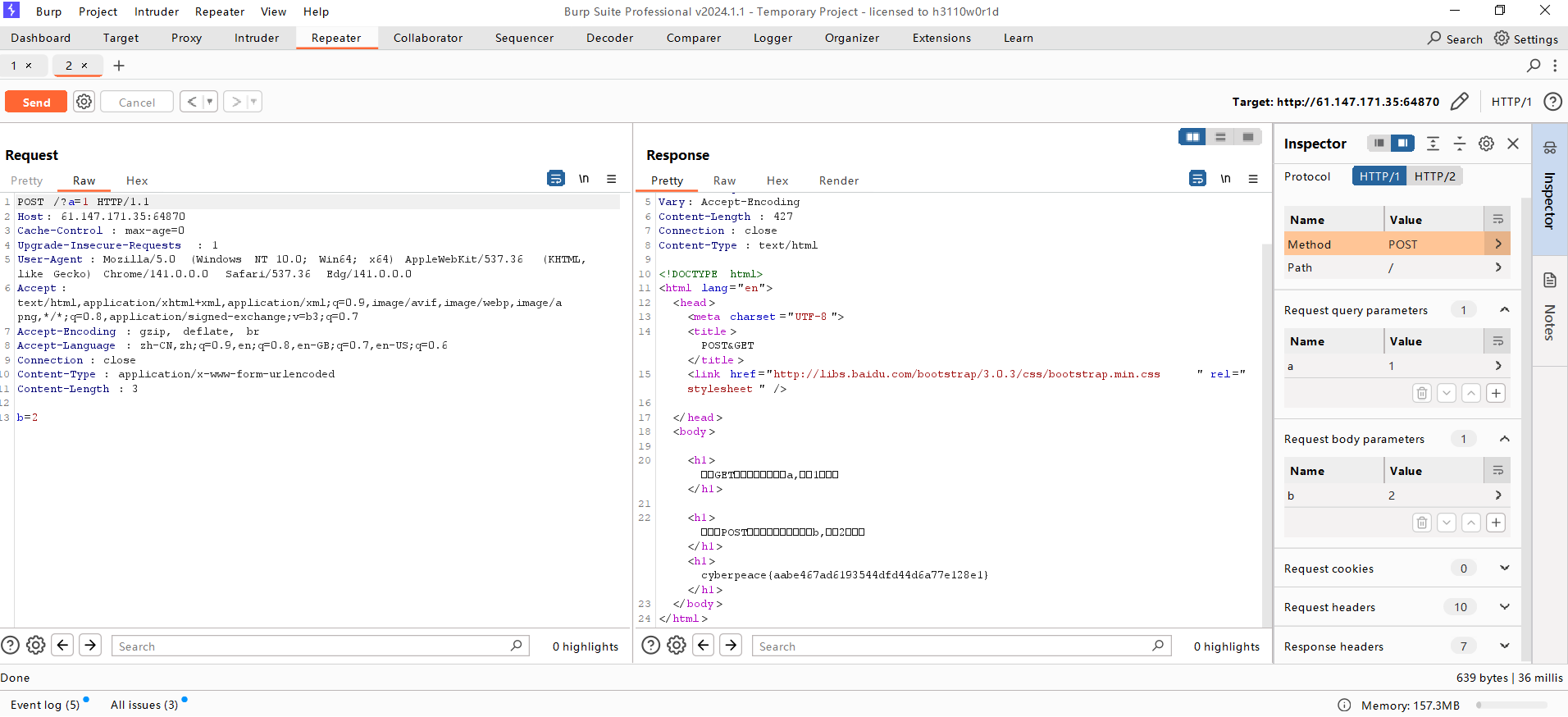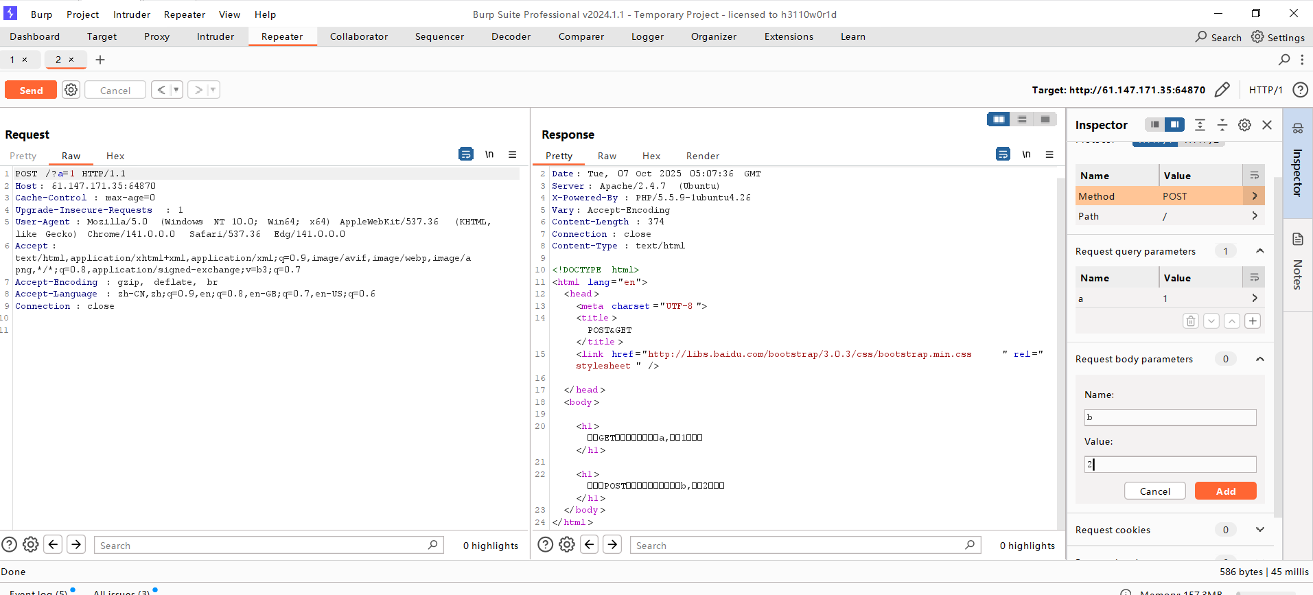 传参了a=1后题目再次要求我们用POST方法传参b=2,这次浏览器无法直接完成传参,改为使用brup Suite完成后续操作。