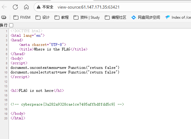 题目提示,view_source,也就是说FLAG值可能在源代码中,描述中右键不管用了,也就是说屏蔽了右键查看源代码
