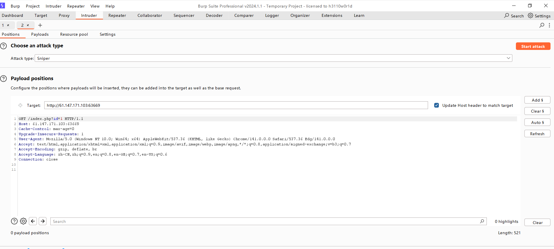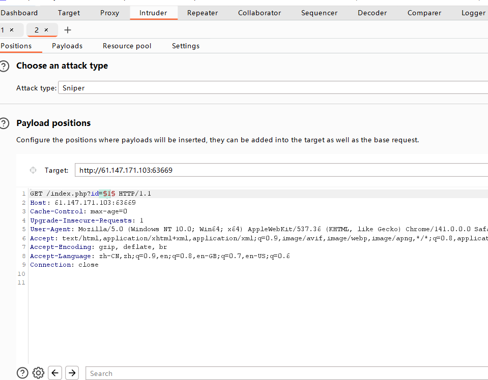 设定需要爆破的位置,我们想在id=1 id=2这样一个一个试出来,所以我们的爆破位置在id=后面,为1 前后包Add 符号