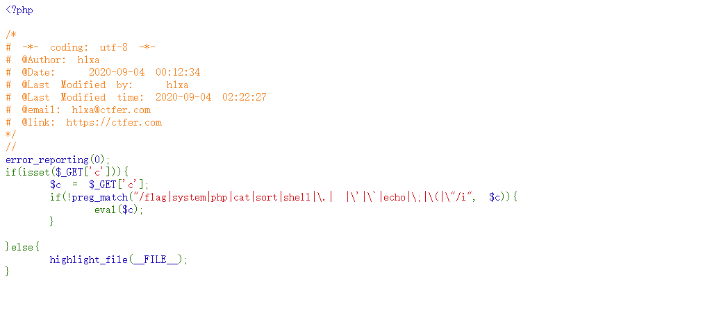 if(!preg_match("/flag|system|php|cat|sort|shell|\.| |\'|\`|echo|\;|\(|\"/i", $c)){