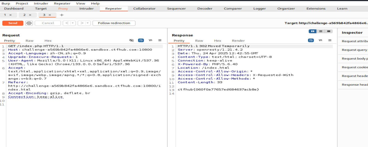 点击左上角的【Send】,重新请求该地址,会发现php进行了一个302请求,如Response第一行所示,在最下方,可以看见我们要获取的Flag